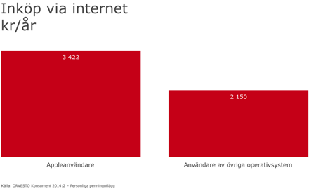 Data från ORVESTO Konsument 2014:2 visar att vi har samma mönster i Sverige: de som äger en av de Appleprodukterna ovan lägger 3 422 kr per år på köp via Internet, vilket är nästan 60% mer än dem som har en motsvarande produkt från en av Apples konkurrenter.